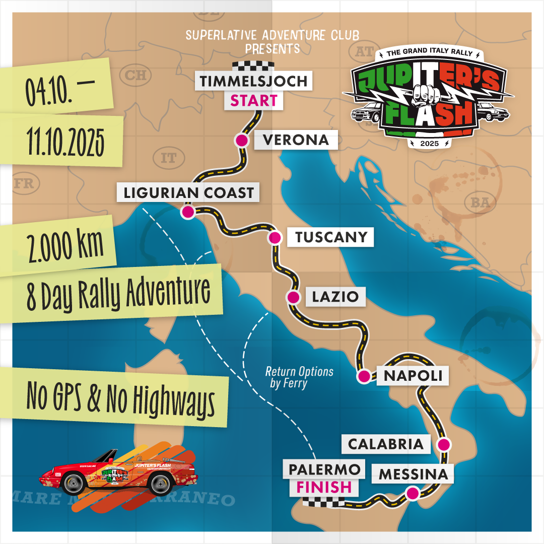 Bei Jupiters Flash stehst Du unter Strom. Lass Dich von den schroffen Berglandschaft Norditaliens, den mit Zypressen gesäumten Straßen der Toskana und den zerklüfteten Küstenverläufen Süditaliens elektrifizieren. Die italienische Lebensart wird Dich bei Jupiters Flash treffen wie ein Blitz – mit all ihrer Vielfalt und Charme. Bei The Grand Italy Rally heißt es fahren wie Gott in Italien!